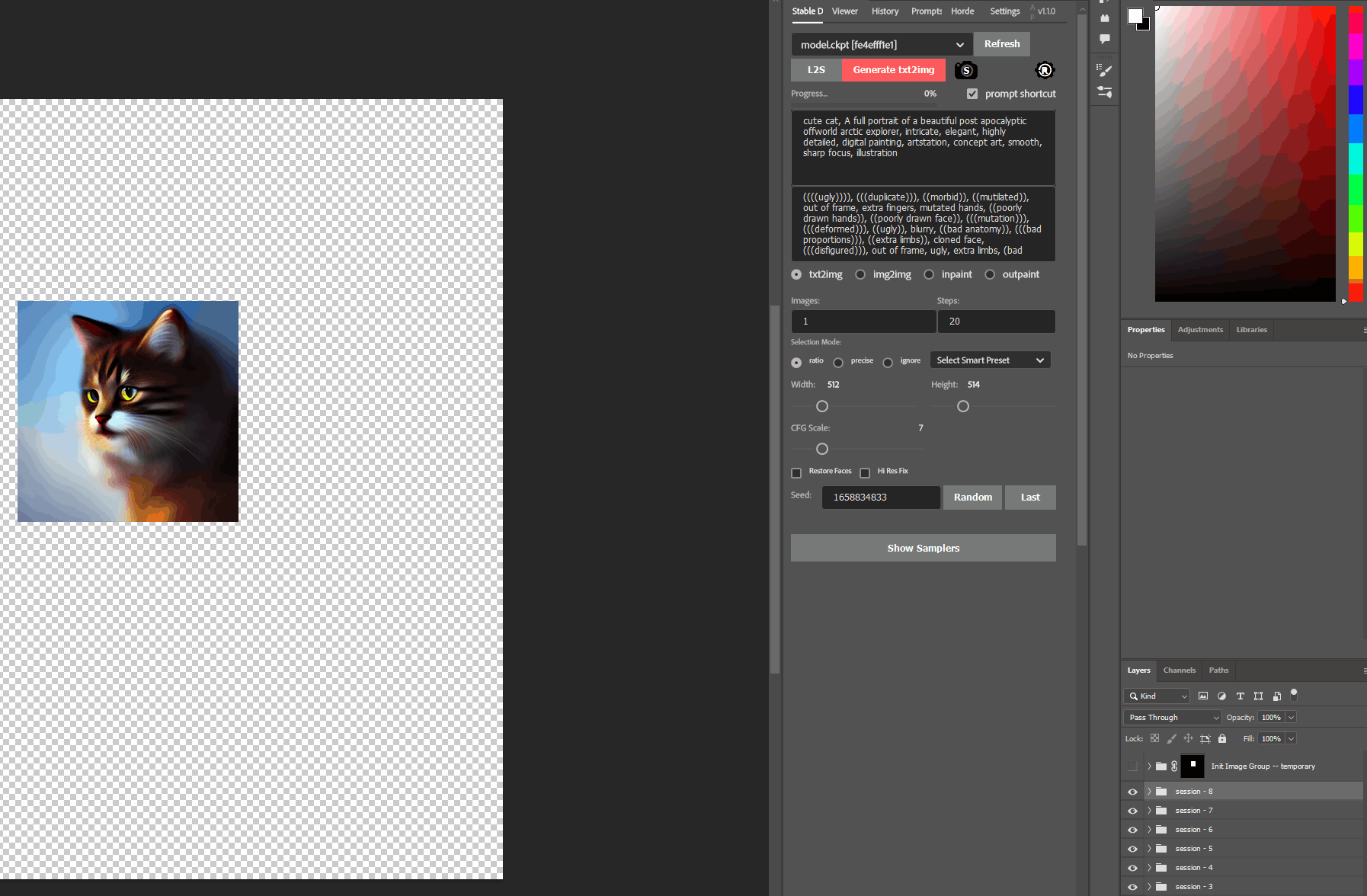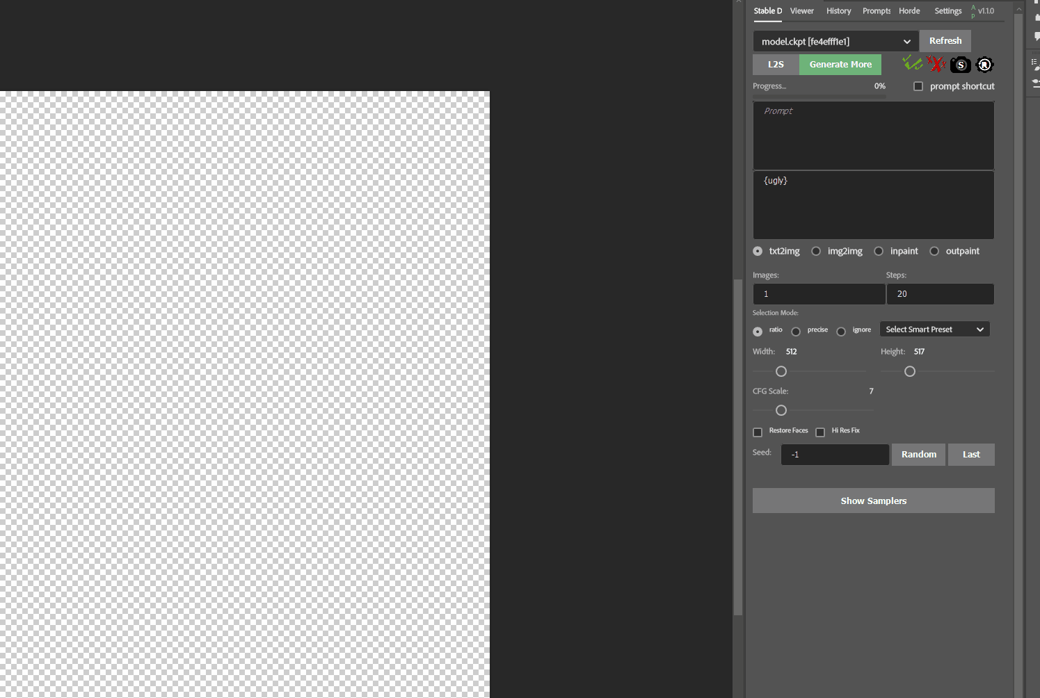 - Selection Mode Ratio: the generation dimension will be set automatically to match the proportion of the photoshop selection, using 512 as the base value.