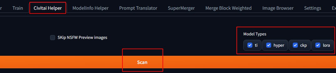 Click it and the extension will scan all your models to generate SHA256 hashes, using them to retreive model information and preview images from Civitai.