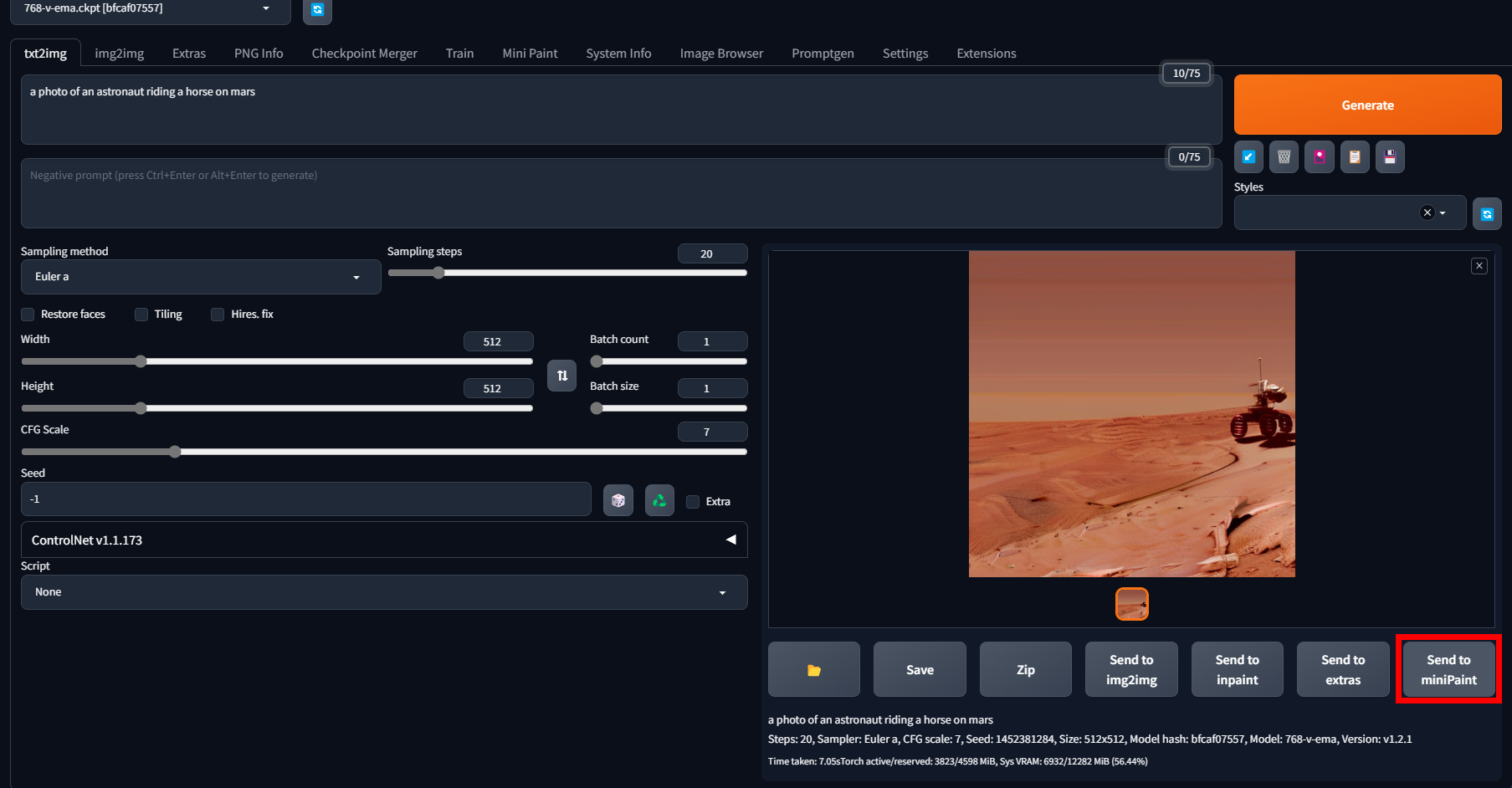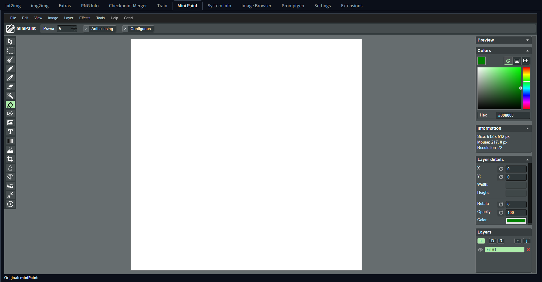 Images can also be sent from txt2img, img2img and extras directly to the extension via the 'Send to miniPaint' Button.