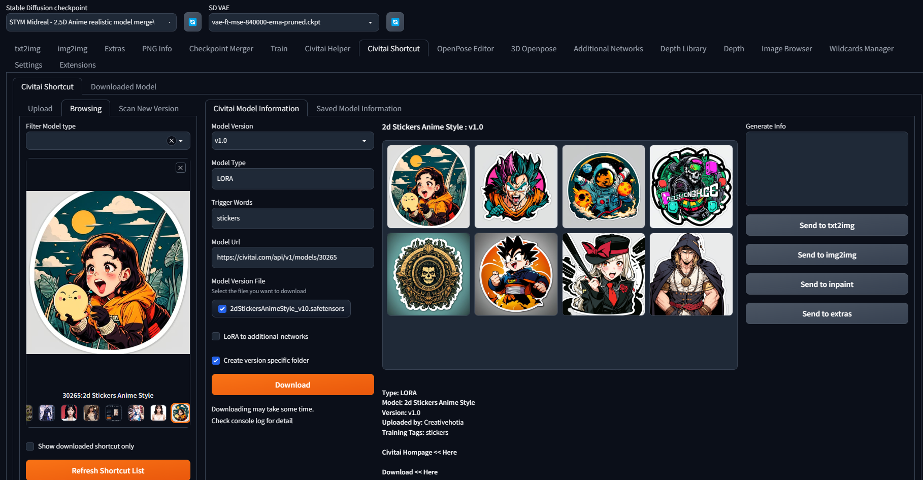 - The information in the Civitai model information tab is obtained in real-time from the Civitai website. Download : downloads the model for the selected version. You can choose to create specific folders for each version. The downloaded model will be automatically saved in the appropriate location, and a preview image and info will be generated together with it.