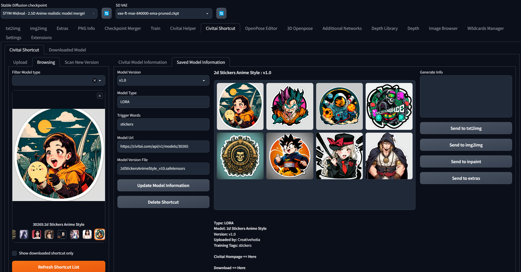 - The information in the Saved model information tab are composed of the information saved on the Civitai website when creating the shortcut. Update Model Information : updates the information of an individual shortcut to the latest information. This function only works when the site is functioning normally. Delete Shortcut : deletes the information of a registered shortcut.