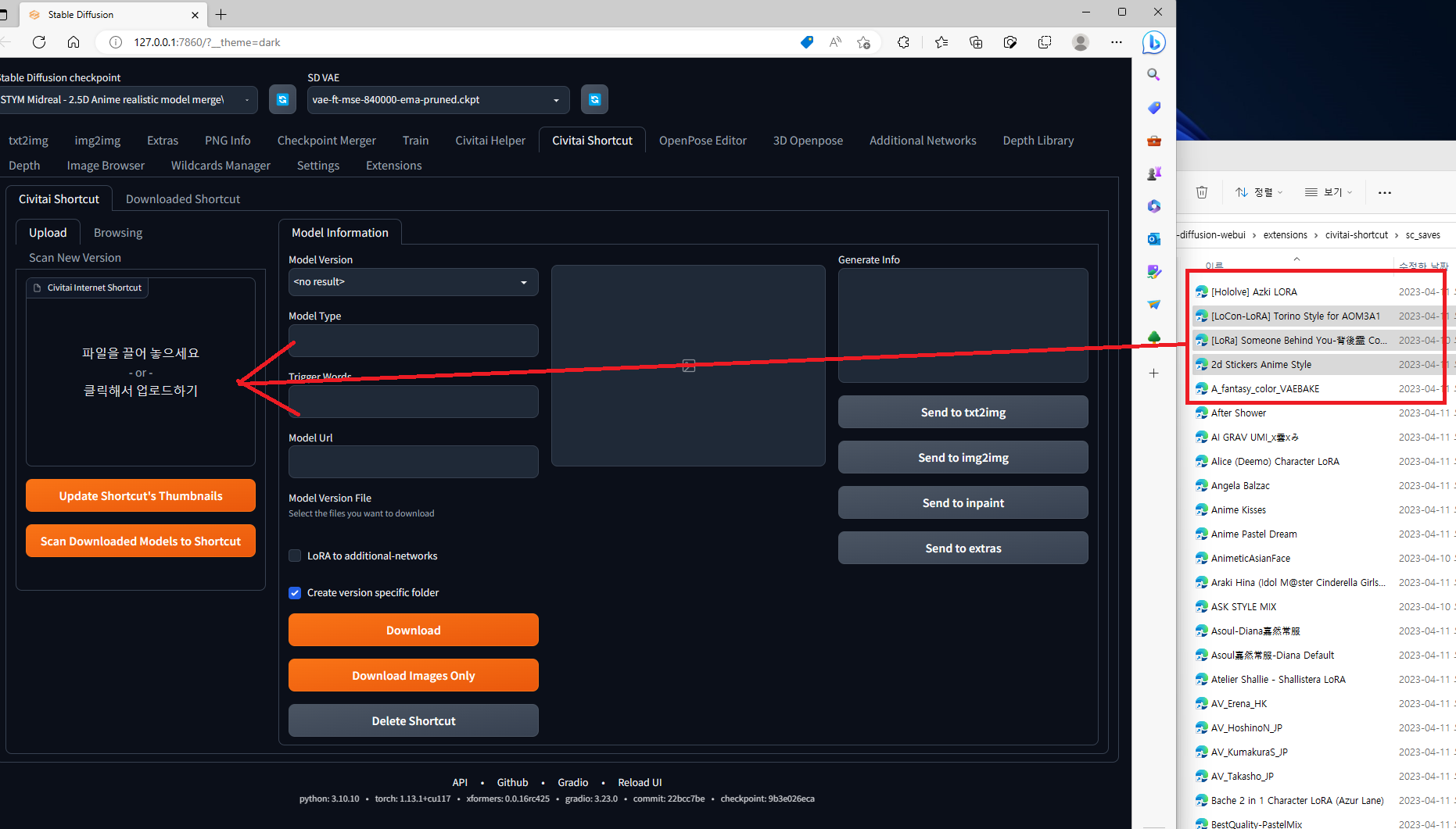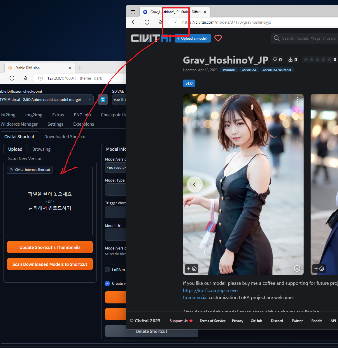 - Upload : This function creates a shortcut that can be used by the extension when you enter the Civitai site's model URL. It only works when the site is functioning properly. You can either click and drag the URL from the address bar or drag and drop saved internet shortcuts. You can also select multiple internet shortcuts and drop them at once.