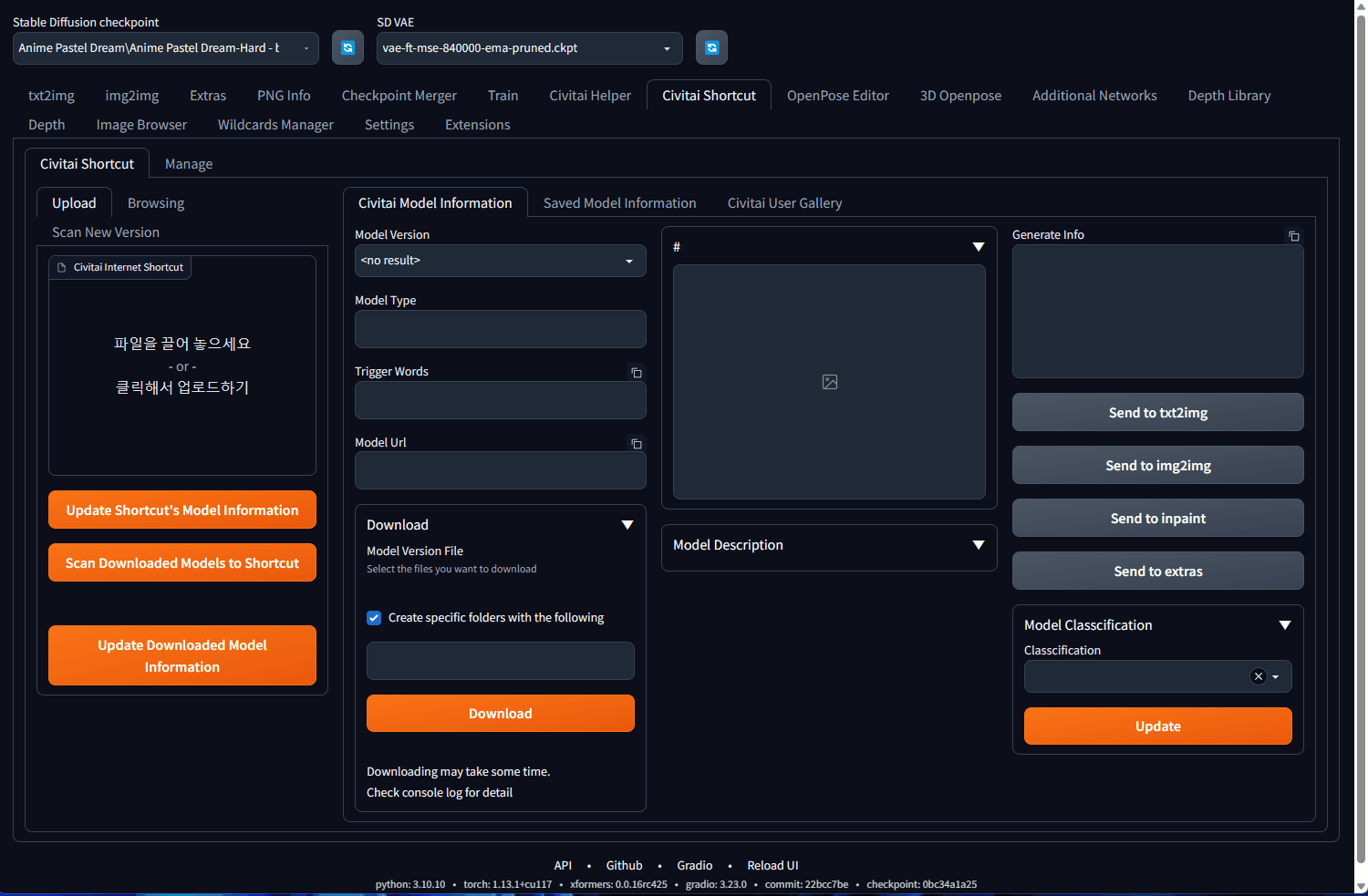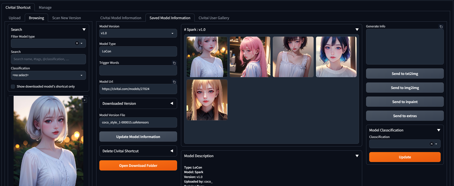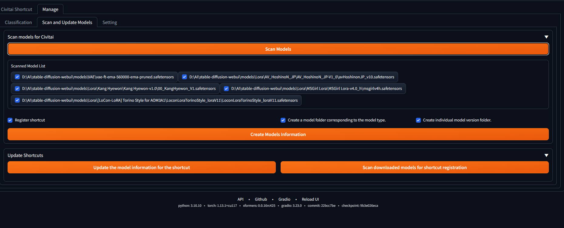 - Scan and Update Models Scan Models for Civitai - Scan and register shortcut for models without model information that are currently held. Update Shortcut - Move the shortcut update function from the Upload tab. Update the model information for the shortcut - Update the information of registered shortcuts with the latest information. Scan downloaded models for shortcut registration - Register new shortcuts for downloaded models that have been deleted or have missing model information.