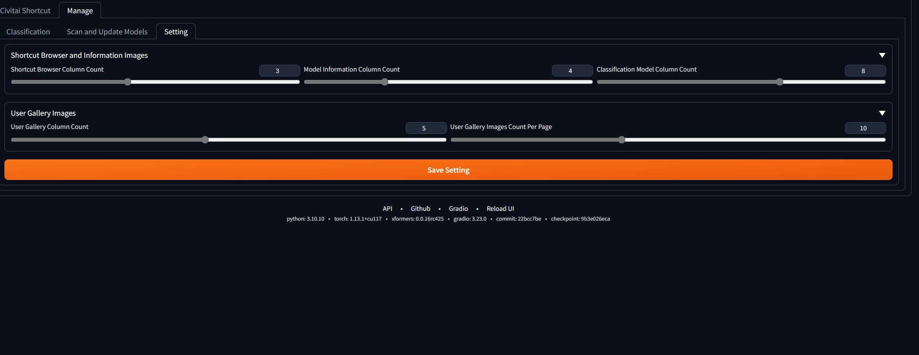 - A new feature has been added that allows you to manage and classify items. You can add, delete, and update classification items in the "manage" -> "classification" tab. To add a shortcut, select the desired classification item in the center top and click on the list on the left to register the desired shortcut. When you click, the registered shortcut appears in the center of the screen, and you can remove it by clicking on the registered shortcut. Click the "update" button to complete the registration. In the "civitai shortcut" -> "information" tab, a "model classification" item has been added on the right side, and you can perform registration and deletion of shortcuts for the model corresponding to the desired classification item. After modification, click the "update" button to complete the task.