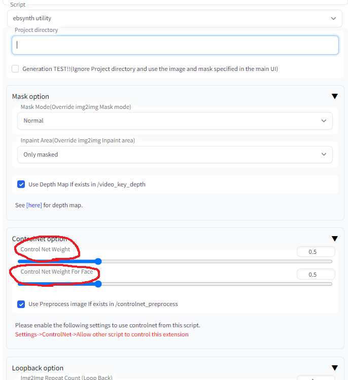 Warning : "Weight" in the controlnet settings is overridden by the following values controlnet_option_in_ebsynthutil