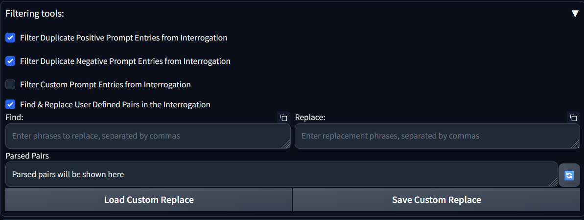 Replace]: Users can add their custom phrases and words replacements, seperated by comma, in the provided textbox. Leaving an entry blank will result in deleting the word from the interrogation prompt. - [