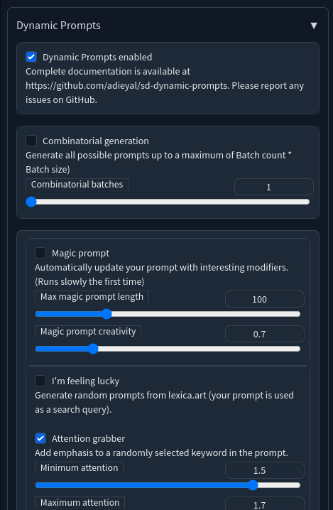 This tutorial has covered the basics. There are additional features to try out once you feel comfortable using the tool. You can find a list of syntax examples [here](SYNTAX.md). This extension is constantly evolving, so make sure to update often. Feel free to ask questions [here](https://github.com/adieyal/sd-dynamic-prompts/discussions) and raise issues [here](https://github.com/adieyal/sd-dynamic-prompts/discussions).