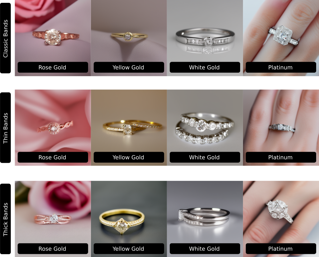 What if we wanted an image of a platinum ring as well? We can use the Dynamic Prompts variant syntax, e.g.