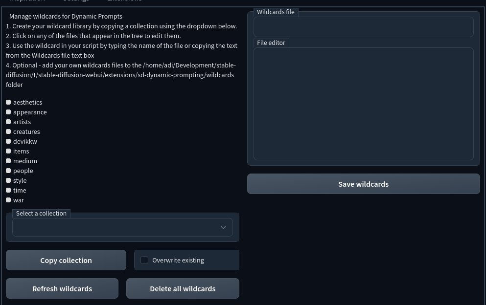 A well-designed wildcard collection can be used as building blocks for creating great prompts without having to reinvent the wheel every time. Dynamic Prompts provides an extensive library of wildcards that you can use wholesale or pick and choose files that you're interested in. You can see these collections in the Wildcards Manager tab. Of course, you can create your own wildcard files and place them in the wildcards directory.