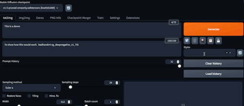 - It will track both prompt and negative prompt history for txt2img and img2img.