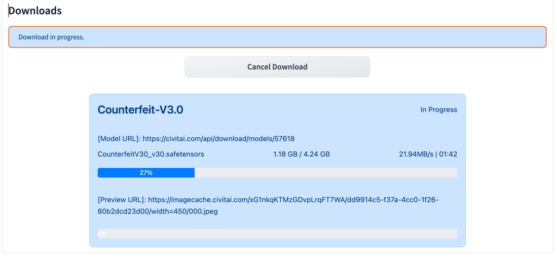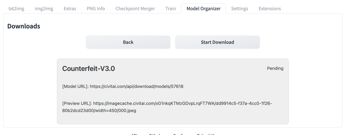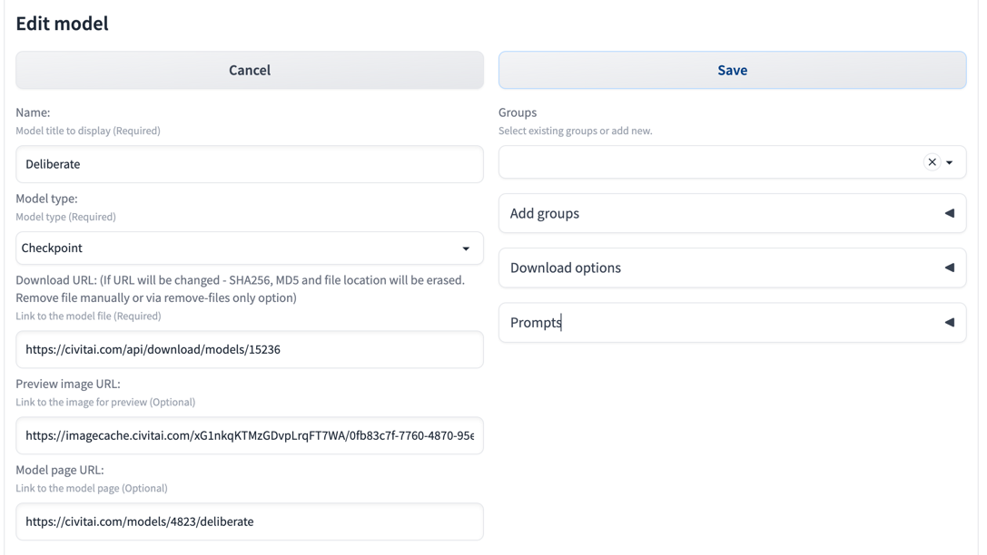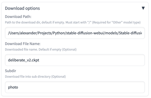 Checkpoint,VAE,Lora,Hyper Network,Embeddingand otherOther. IfDownload pathis not defined in theDownload optionssection, model will be downloaded to the default model's path defined in webui. Also default path might be changed in the extension settings. Note:Othertype requires toDownload pathto be set in theDownload Options - Download URL - Link to the model file to download (Required). Note: if URL will be changed during editing - SHA256, MD5 and file location will be erased. Remove file manually or via remove-files only option