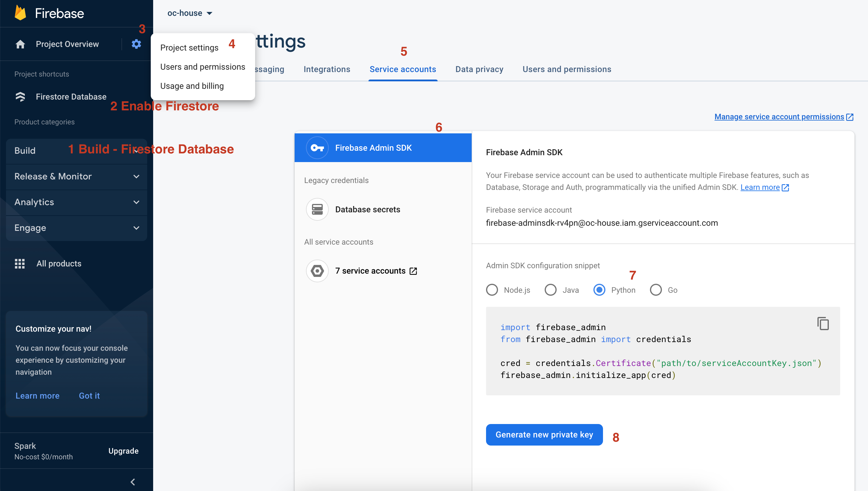 Project settings,Service AccountsTab, SelectFirebase Admin SDk, click onGenerate new private key. - Download json file, move it to the