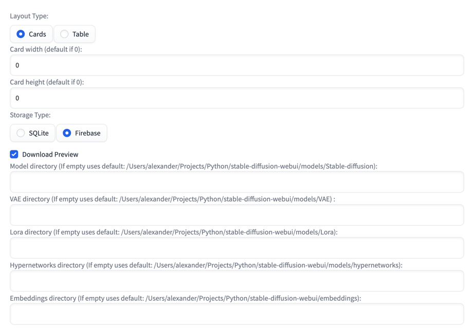 SQLiteis selected by default and stores data in{sd-webui}/extensions/sd-model-organizer/database.sqlitefile.Firebaseoption allows to store records data in the remove Firestore database, follow instruction in the separate section of this page for setup. - Download Preview - Enabled downloading models preview with model. Checked by default.
