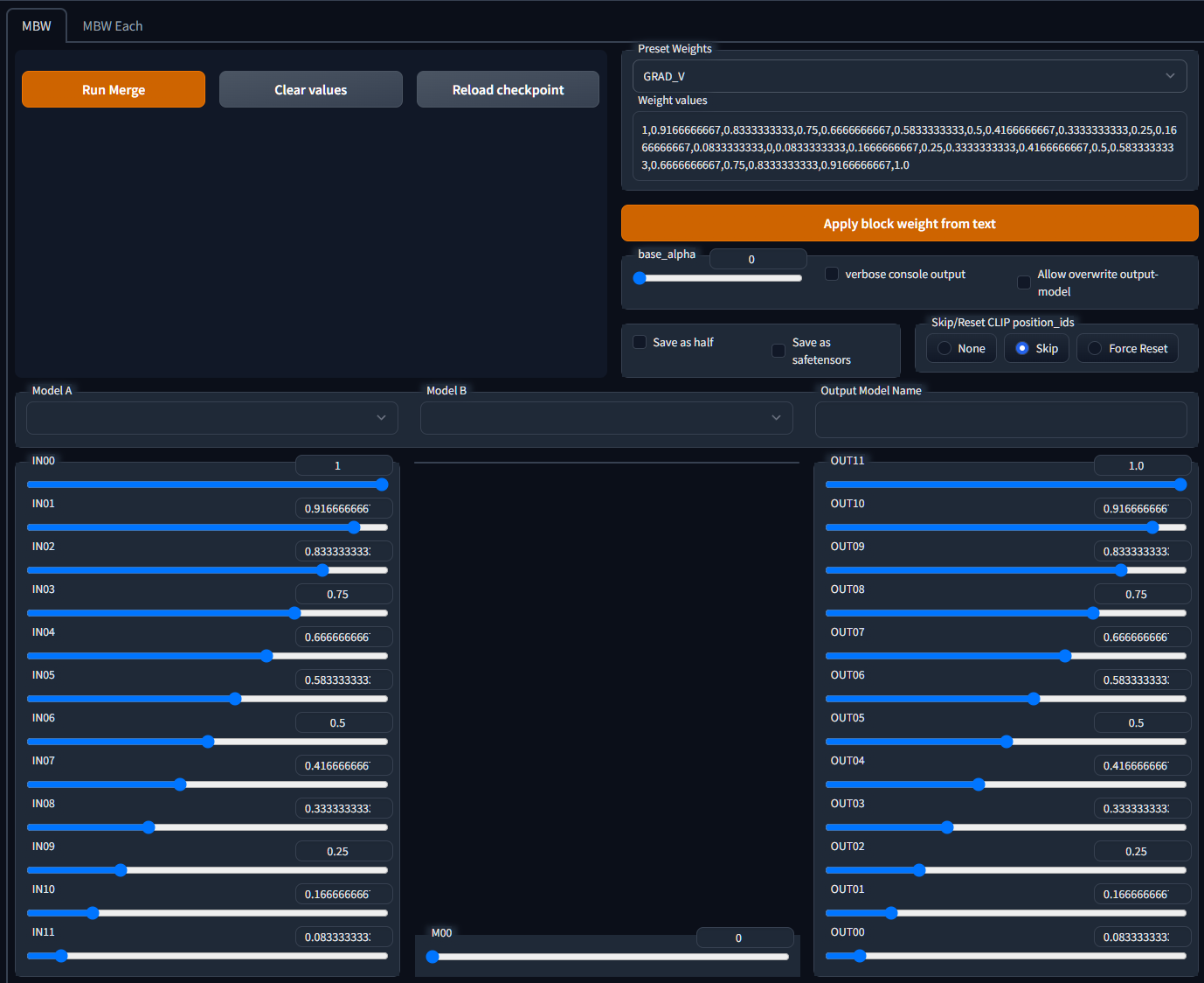 Merge models with separate rate for each 25 U-Net block (input, middle, output).