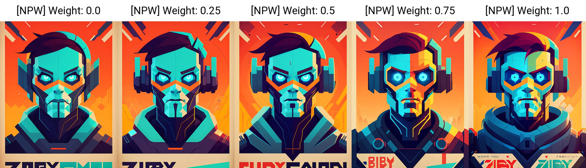 Here are some comparisons between NPW and Attention/Emphasis. So, top row is using NPW and bottom row is using the (Negative Prompt: weight) syntax with the same weights.