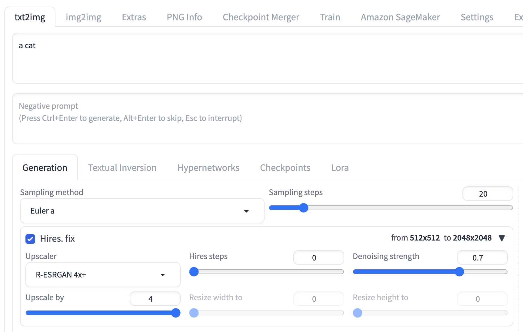 これらのプラグインを使うことで、限られた GPU メモリで超解像度の画像を生成できます。 ここでは文生成(txt2img)でのプラグインの使い方を説明します。