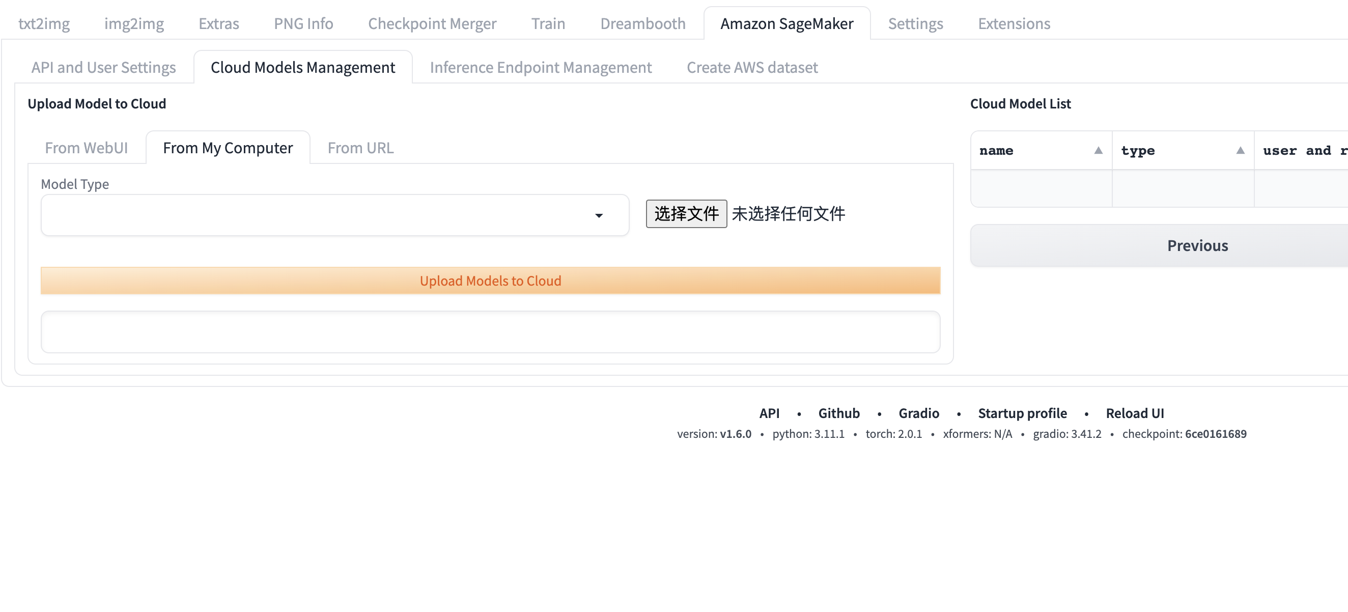 考虑到用户多样的使用场景,本方式适用于将webUI前端部署在非本地电脑的其他机器上的场景。同于webUI社区原生使用方式,用户需要首先将相关模型上传至部署了webUI前端的机器上,对应webUI项目文件夹下、models子文件夹的对应处,之后即可跟从下面步骤完成模型上传到云上。
