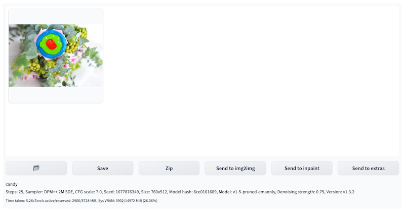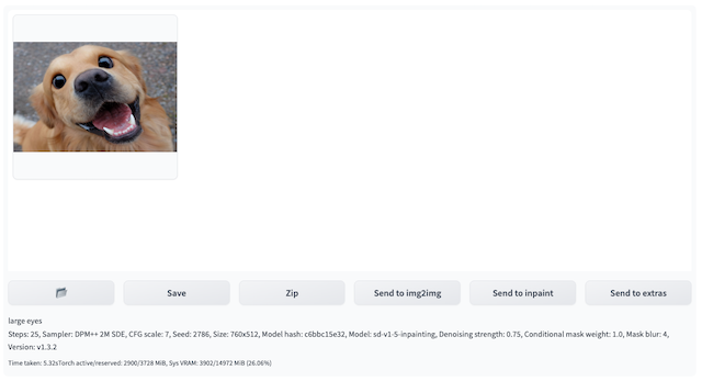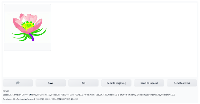 查看推理结果。通过点击Inference Job Histories: Time-Type-Status-UUID右侧的刷新按钮进行下拉列表刷新,查看最上方的、符合推理提交时间戳的Inference Job ID。img2img标签页右上方的Output区域会显示推理的结果,包括图片,提示词以及推理的参数等。在此基础上,可以点击Save或者Send to extras等,进行后续工作流。