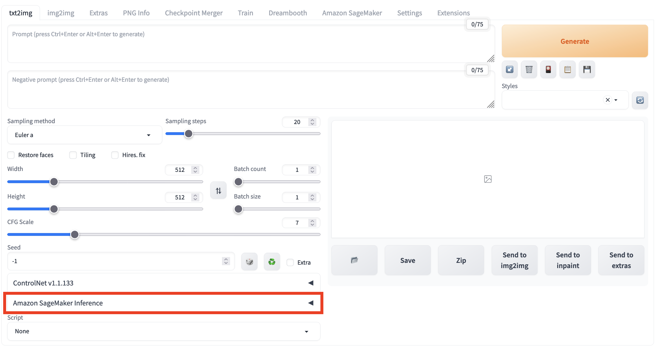 您可以打开txt2img标签页,通过结合使用txt2img原生区域及解决方案新增面板Amazon SageMaker Inference,实现调用云上资源的txt2img推理工作。