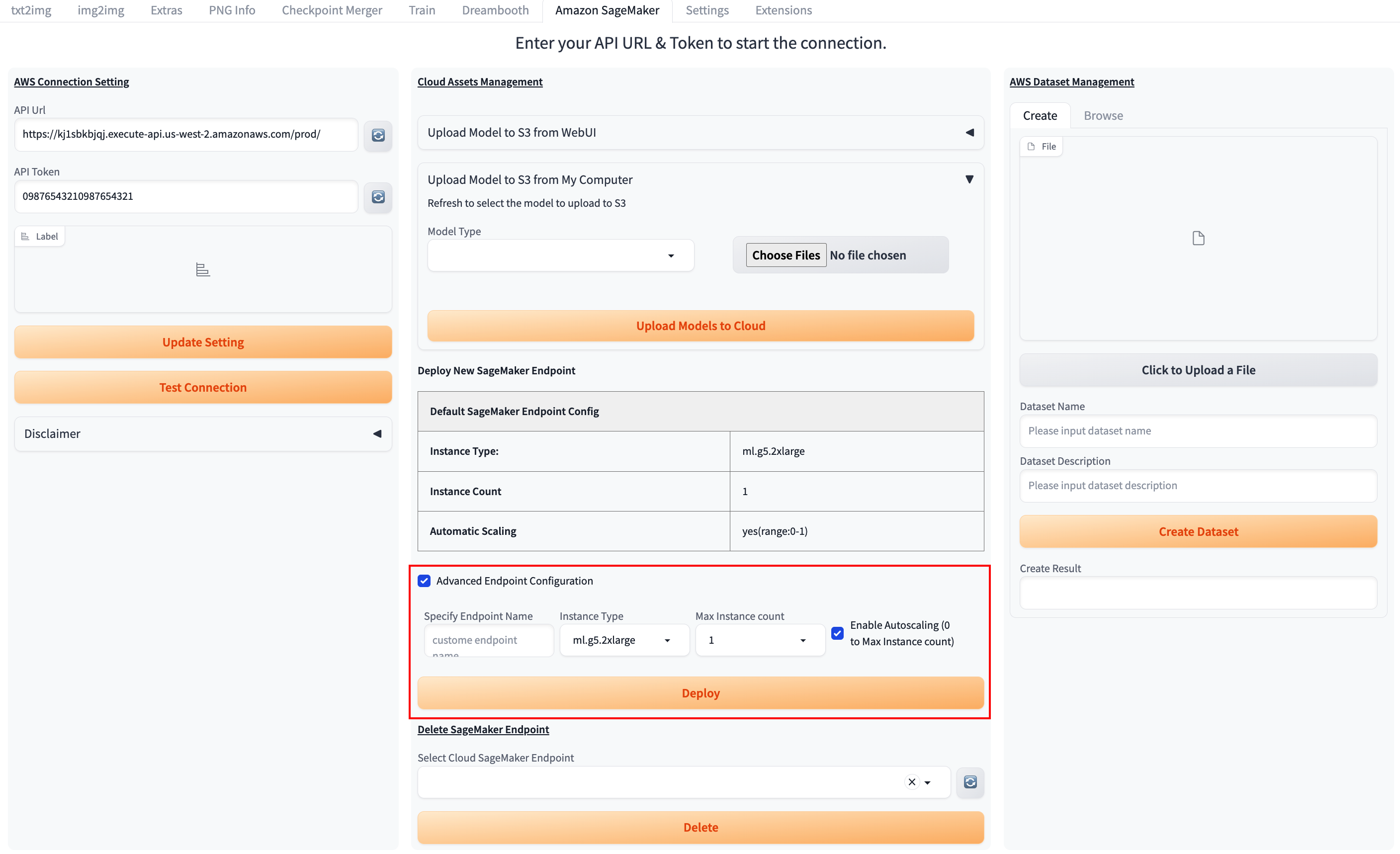 参数名 描述 Endpoint Name (可选) 如果需要指定Sagemaker endpoint的名字,在这个输入框中输入,如果不修改这个值,默认的Endpoint的名字为infer-endpoint-XXXXX Instance Type 下拉框选择部署的Endpoint的实例类型 Max Instance count 下拉框选择部署的Endpoint的实例最大值,如果选择了Autoscaling,Sagemaker会根据CPU的平均占用率在0-Max Instance count之间弹性伸缩 Enable Autoscaling 如果选择了该checkbox,Sagemaker会根据CPU的平均占用率在0-Max Instance count之间弹性伸缩, 否则Endpoint对应的instance数会固定在Max Instance count -