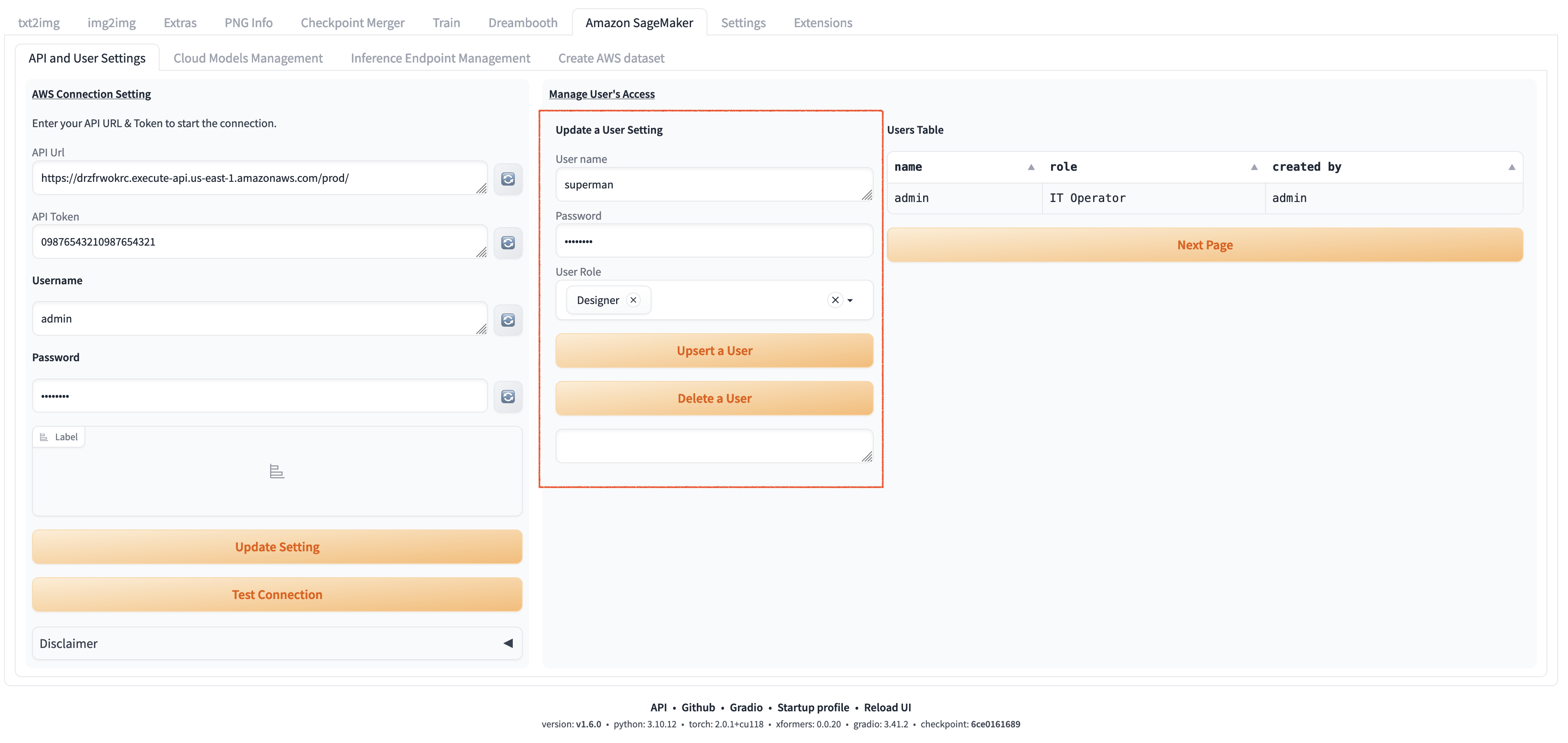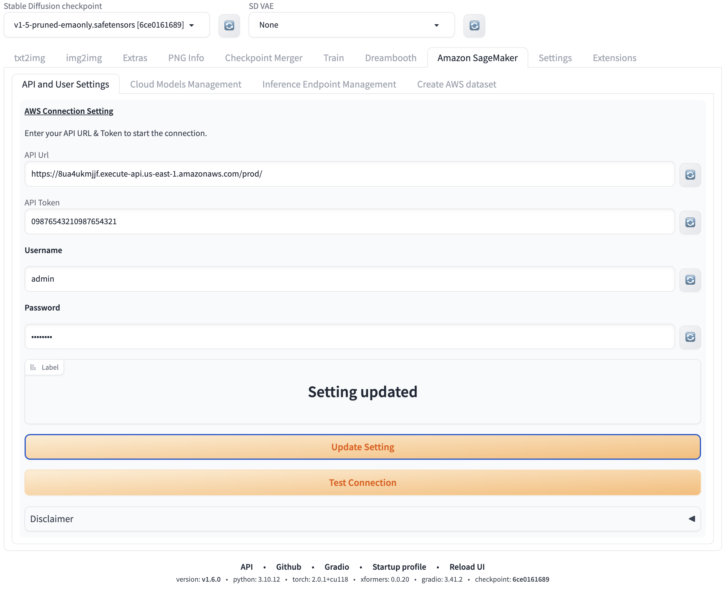 当部署完成后,首次登陆webuI,此时,用户无需用户名密码登陆。点击Amazon Sagemaker页,填入api url和api token,按顺序点击Update Settings和test connection。