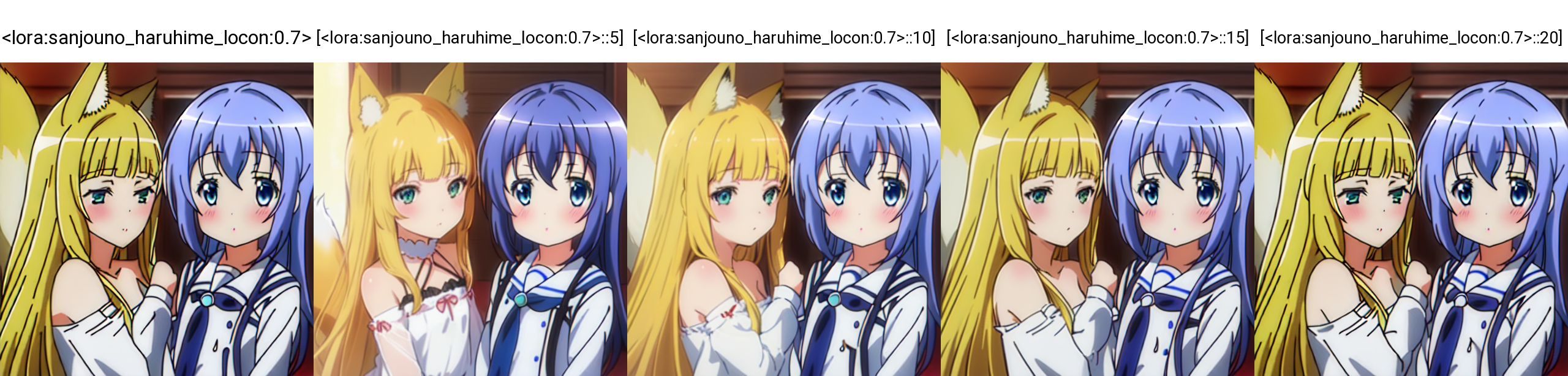 <lora:roukin8_loha:0.8>withyamanomitsuha, and<lora:dia_viekone_locon:0.8>withdia_viekone_\(ansatsu_kizoku\)can successfully generate the corresponding characters. - When the trigger words are swapped, causing a mismatch, both characters cannot be generated successfully. This demonstrates that