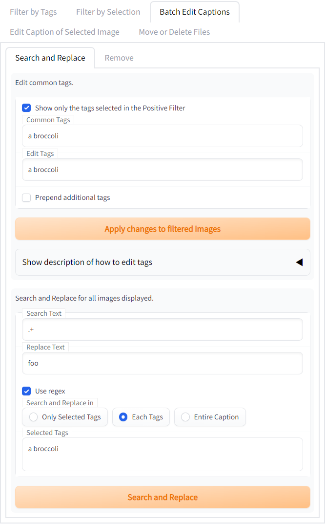 - replace/remove tags or append new tags in "Batch Edit Captions" tab