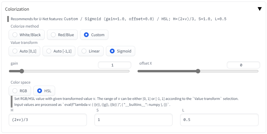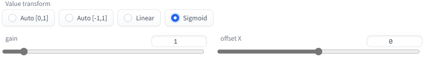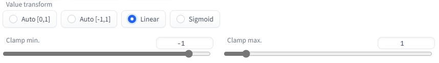 Linear first clamps feature values to specified Clamp min./max. range. Then linearly converts values to [0,1] when Colorize method is White/Black and to [-1,1] otherwise.