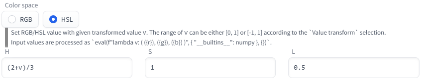 Colored output OUT11, steps 20, Custom, Sigmoid(1,0), H=(2+v)/3, S=1.0, V=0.5