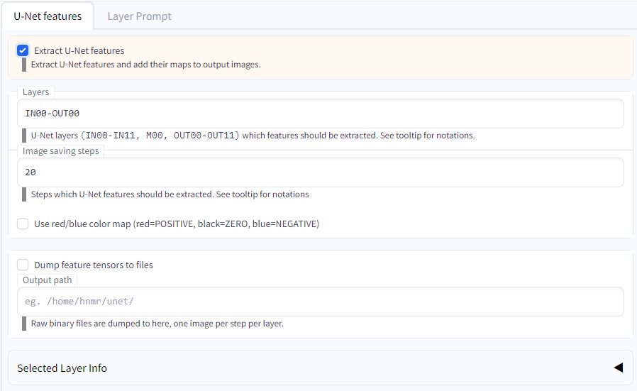 Layer Prompt タブの Output difference map of U-Net features between with and without Layer Prompt をオンにすると、ブロックごとのプロンプトを使った場合と使わない場合で U-Net の特徴量にどのような差があるかを可視化した画像を生成する。