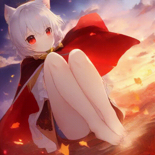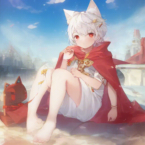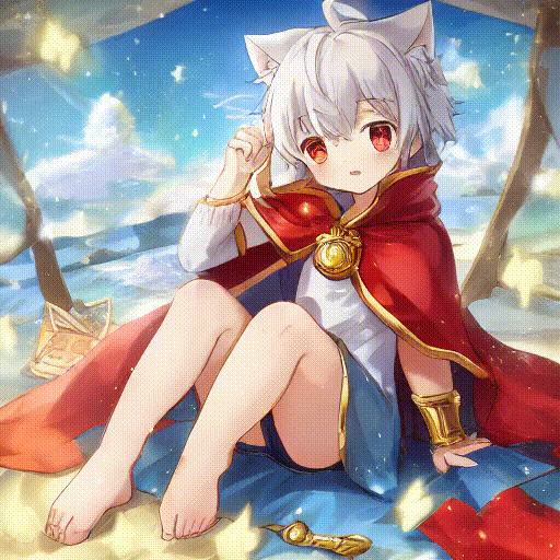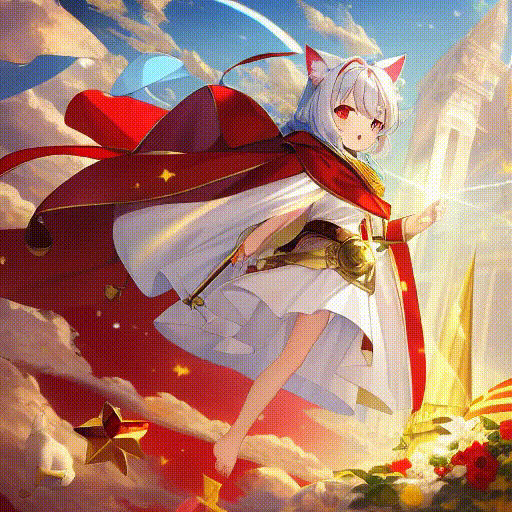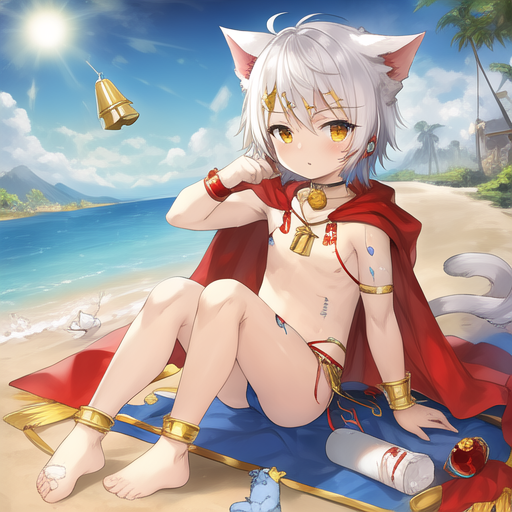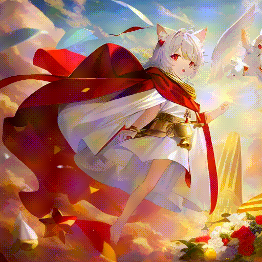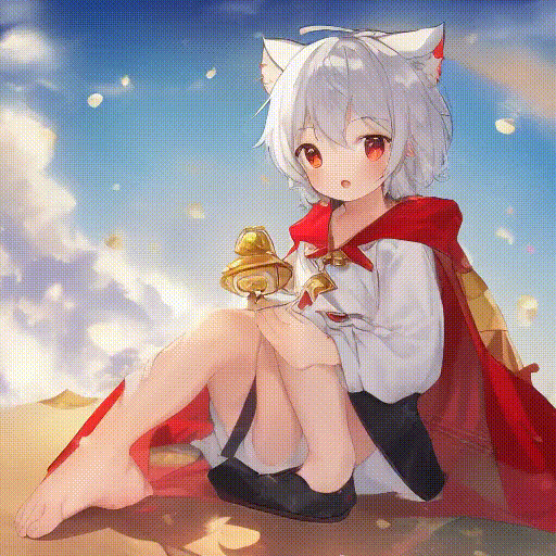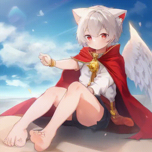 (((masterpiece))), highres, ((boy)), child, cat ears, white hair, red eyes, yellow bell, red cloak, barefoot, angel, [flying], egyptian