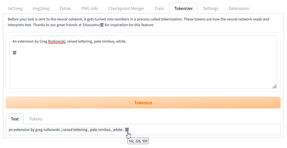 An extension for stable-diffusion-webui that adds a tab that lets you preview how CLIP model would tokenize your text.